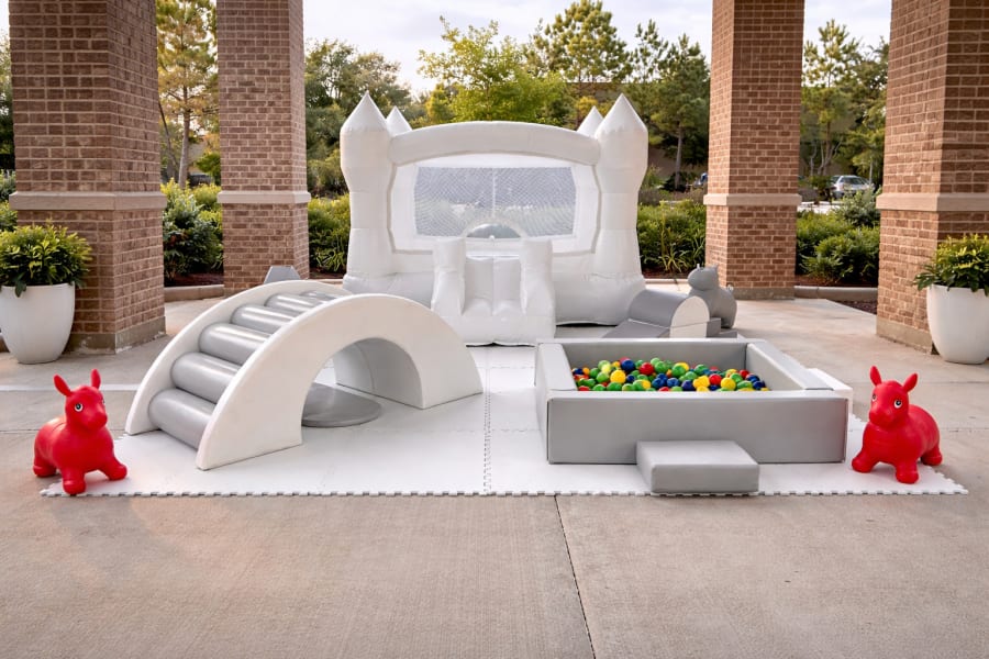 - Mini white bounce house for gentle jumping and photos.