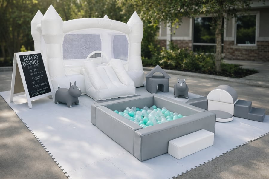 The Modern Mini Soft Play Experience is a thoughtfully curated, neutral-toned play setup designed specifically for toddlers and young children. Featuring premium soft play pieces, a modern ball pit, and a stylish white bounce house, this setup blends fun, safety, and elegance—making it the perfect addition to birthdays, baby showers, and upscale family events.
